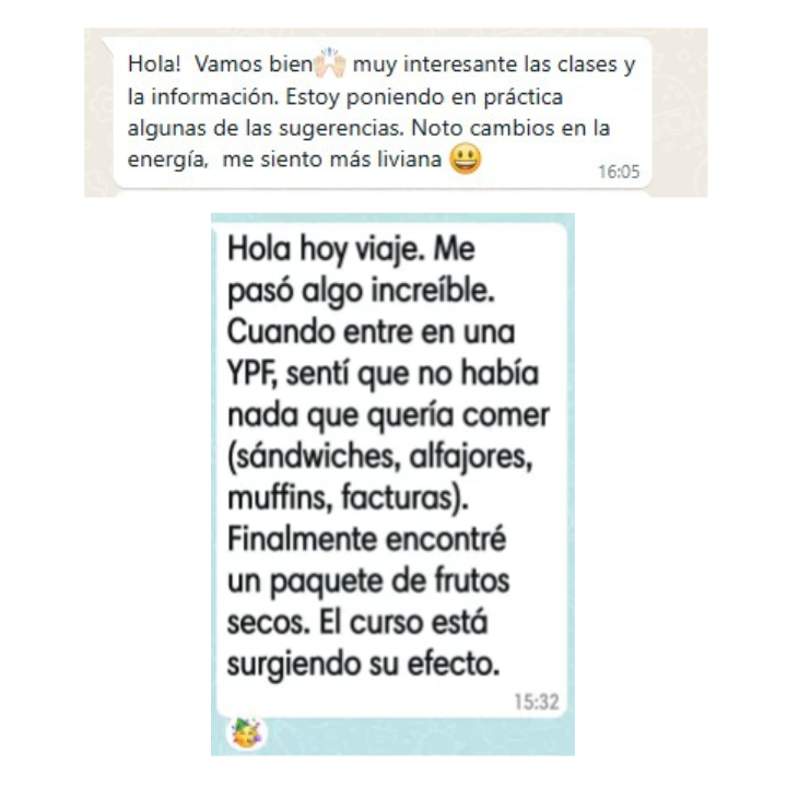 ❓ Respuestas personalizadas en cada encuentro en vivo y a través de Whatsapp en un chat uno a uno con tu nutri y su asistente.